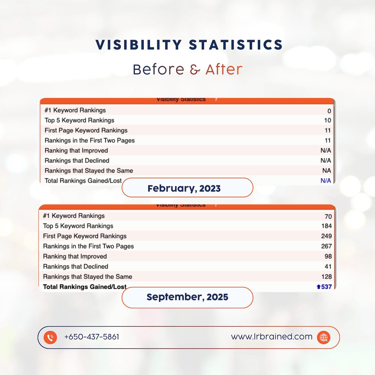 - Achieved 87 #1 rankings (up from 0) and 246 first-page rankings (up from 11) as of September, 2025.